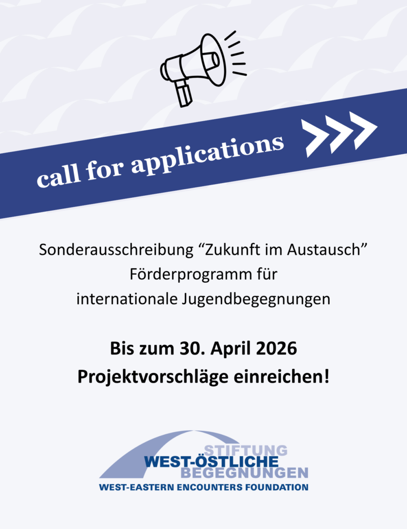 Mit der Sonderausschreibung zur Jugendförderung setzt die Stiftung West-Östliche Begegnungen einen besonderen Förderschwerpunkt im Bereich internationaler Jugendbegegnungen: Gefördert werden drei Projekte mit einer Fördersumme von jeweils bis zu 10.000 €.